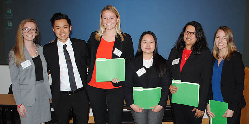 After tallying up the scores, the judges announced the five-person team, composed of health administration majors, as the winner. In Young Lee, Kenny Jiang, Marissa Lalama, Sophia Frank, and Mary Girgis offered a comprehensive analysis of the situation and made recommendations to generate revenues, reduce costs, improve leadership/management and launch an innovative marketing campaign to turn around the situation. Second place went to the team of these students, Eshan Kaul (pre-med), Asraar Naseer (finance/computer science), Yesha Parekh (cell biology/anatomy/pre-med) and Riley Link (public health) and third place to Kathryn Riman (public health/nursing), Tranum Gumber (nursing), and Rishi Desai (public health).